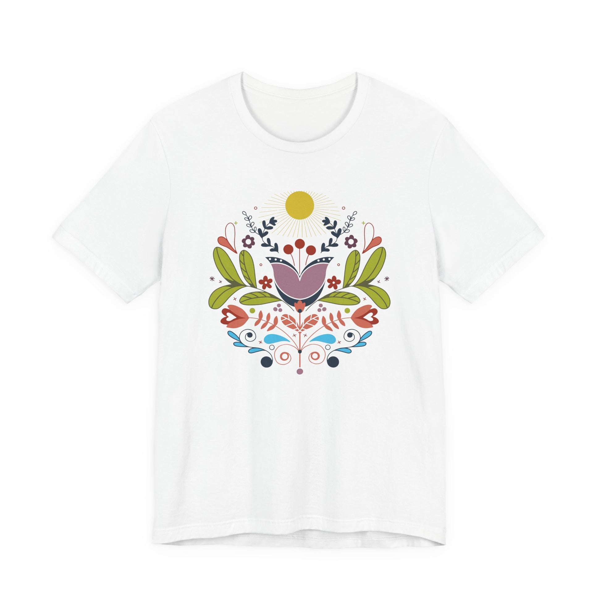 A lightweight, breathable tee with a playful folk-floral print that feels like sunshine and slow afternoons. Wears well with denim, linen skirts, or a favorite cardigan for low-key gatherings, weekend wanderings, and days that call for quiet color.