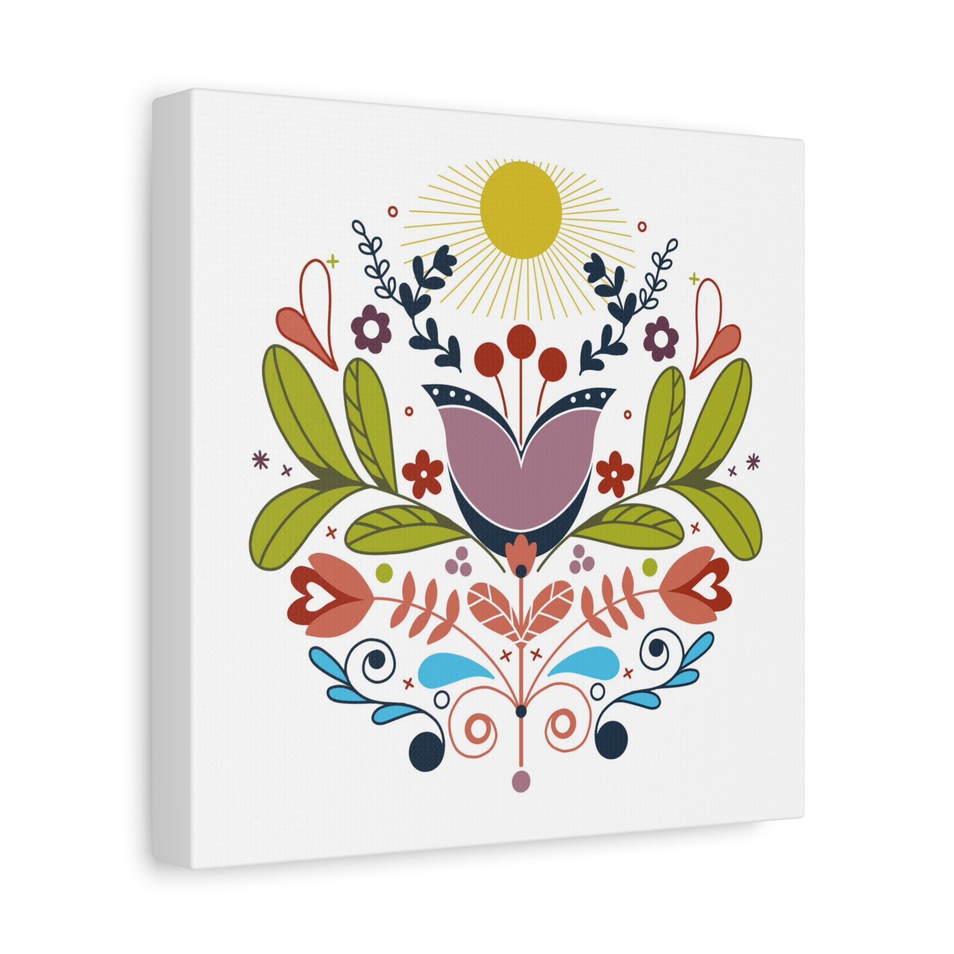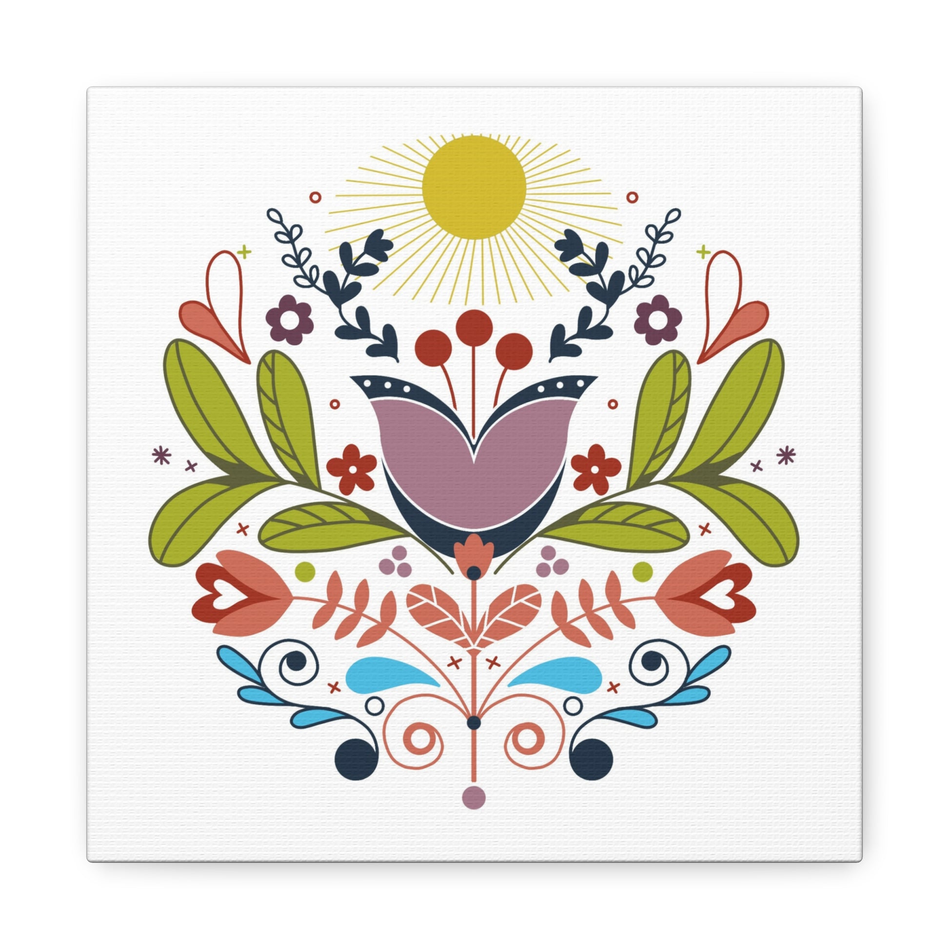 Bright, Scandinavian-inspired folk art canvas print that brings a warm feeling to any room. It settles into kitchens, entryways, nurseries, or cozy reading corners and adds an approachable, handcrafted note to everyday moments.