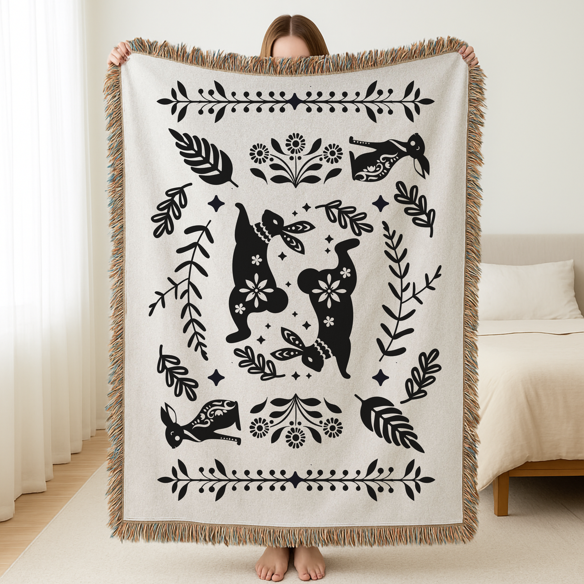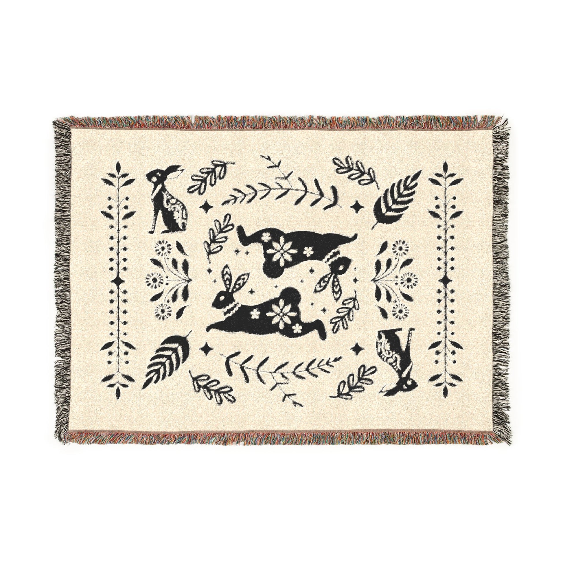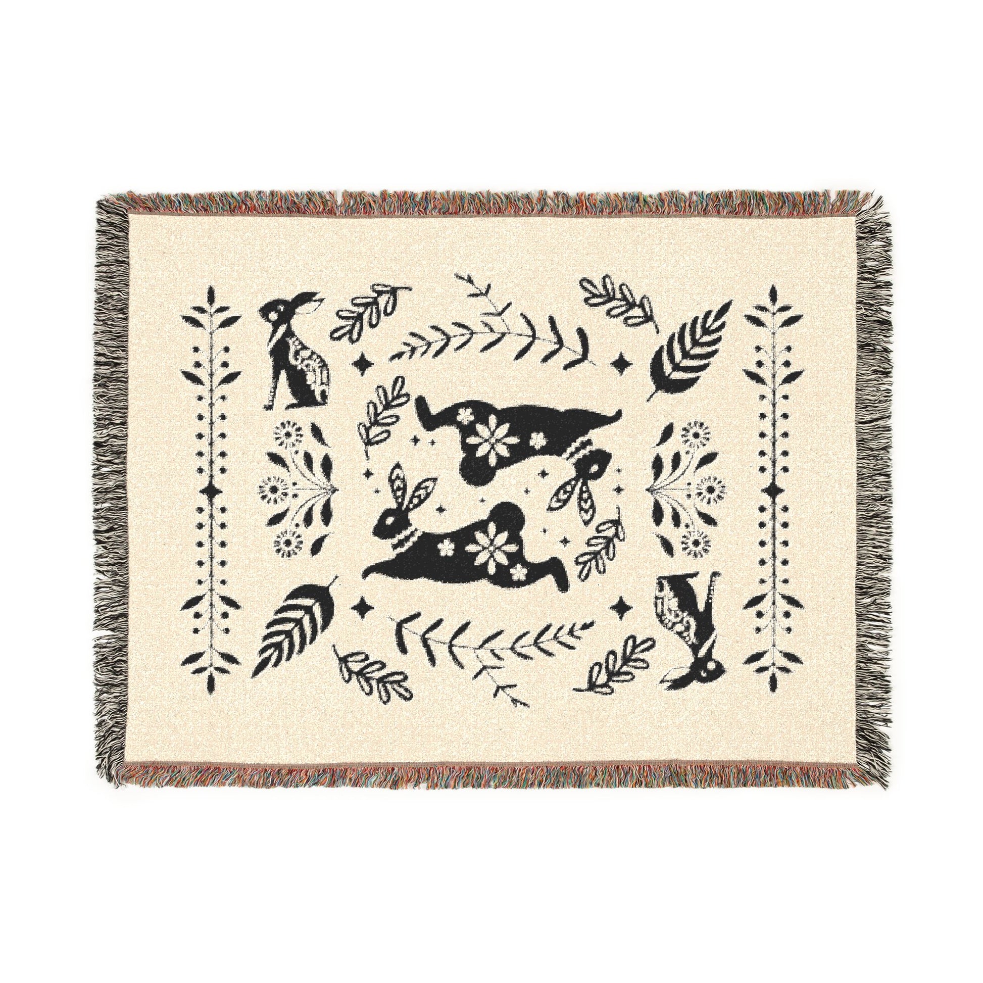 Rabbit Folk Art Woven Cotton Blanket